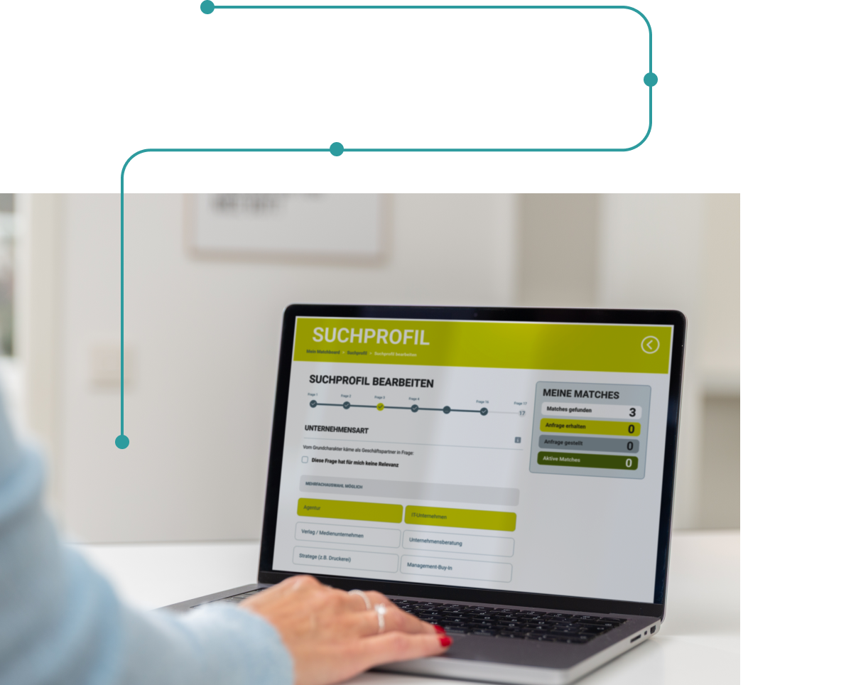 Wenn du lieber direkt selbst aktiv wirst, kannst du unsere Online-Matching-Plattform nutzen. Lege in wenigen Minuten dein Profil an und entdecke potenziell passende Business-Partner.